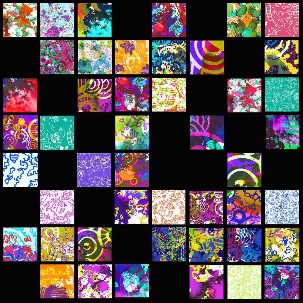 In Ubiquity, 64 panels are arranged in a grid according to a mathematical pattern, Ulam’s Spiral. To generate Ulam's Spiral, label the center panel as 1 and continue to count up as you spiral around the grid, counterclockwise. Then black out the prime numbers. An implicit pattern presents itself; prime numbers seem to line up only in diagonals. Ulam stated that his spiral “appears to exhibit a strongly nonrandom appearance,” yet a pattern can’t be nailed down. Mathematicians still grapple with this elusive problem of discerning a pattern or algorithm to express the distribution of primes. Ulam’s Spiral also appears to be self-similar: the same sorts of patterns that arise in the 1-101 block appear when scaled out 100 times. Despite this, prime numbers are still only known to occur randomly.